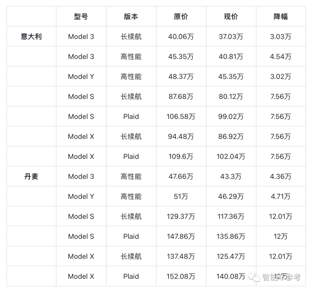 意大利丹麦Model 3、Model Y、Model S和Model X的售价也均有下调。