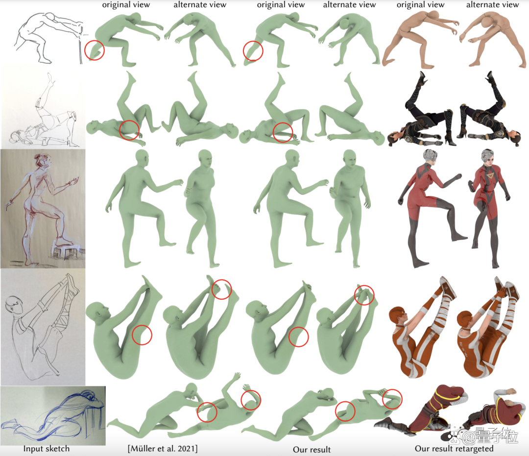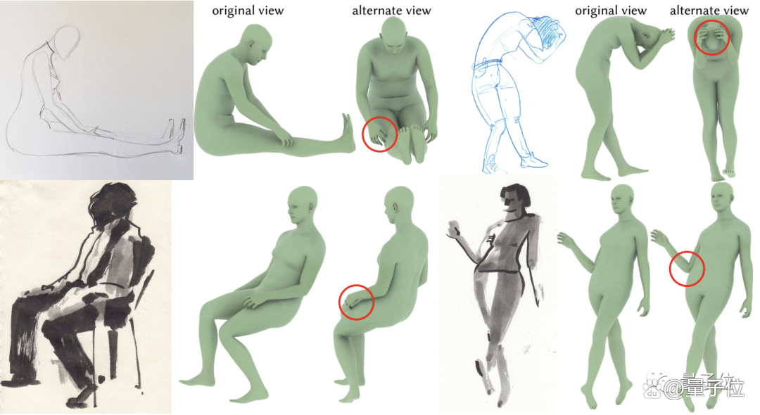 比如上图第一行中的人手(不过我们发现左边的似乎推测有错,手应该是放在两腿之间;右边的抱头基本没啥问题,但手掌应该向后弯曲)。