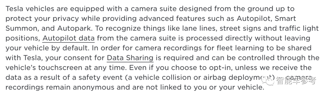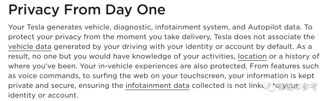 但官网也明确写出,特斯拉一般不会将驾驶车辆生成的数据和车主的身份信息或账户相关联,并且车主在车厢内的其他活动也受到保护。